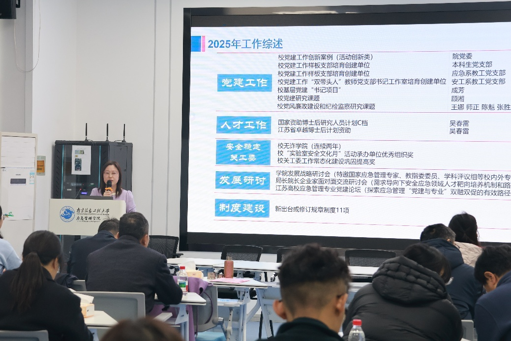 2026年1月15日,应急管理学院全体教职工大会在学科2号楼S103顺利召开。会议主要包括学院领导班子和领导个人述职、民主测评、绩效清算结果解析报告和院级表彰等四个部分。学院全体领导以及全体教职工出席本次会议,会议由副院长顾湘主持。
